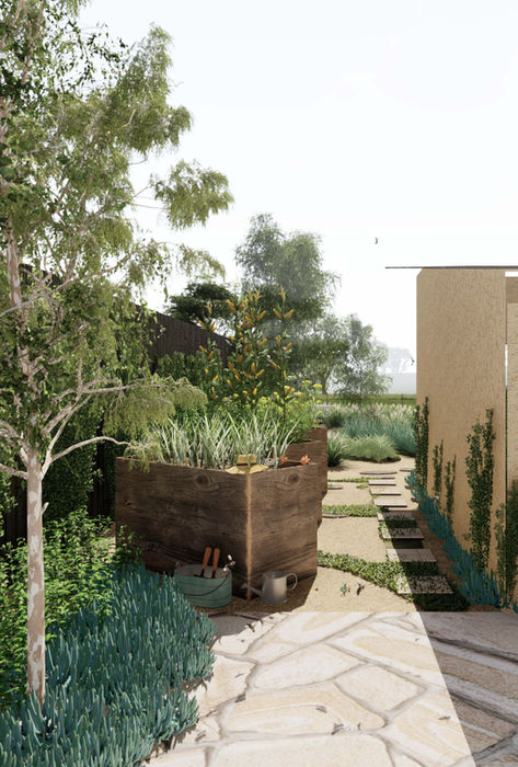 A layered suburban garden that integrates distant golf course views with lush native plantings. Situated on a flat site overlooking The Sands golf course, the design follows a layered, meandering pattern that transitions from a dense, formal planting at the front to a loose, relaxed arrangement in the backyard—creating a clear and inviting distinction between the two outdoor realms. This approach brings the expansive horizon and majestic trees into the immediate surroundings of the home while crafting diverse, functional living spaces. Currently unbuilt, the garden is conceived as a harmonious blend of nature and everyday living in a suburban setting.